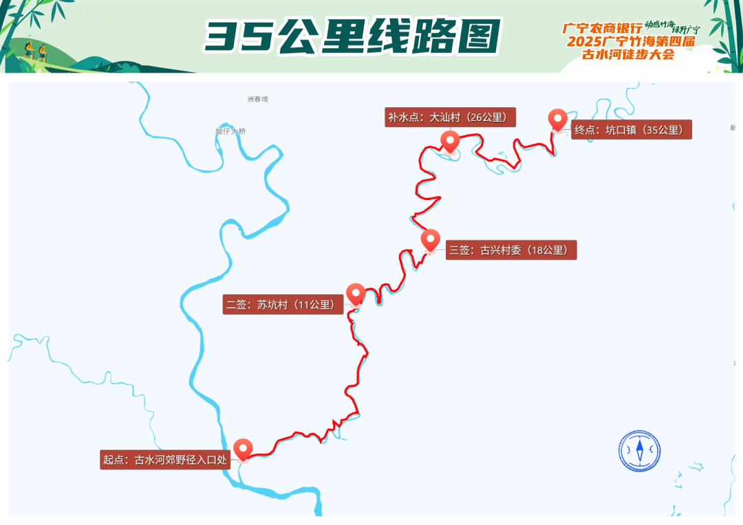 古水河郊野径入口(起点:0KM)—连石—油树坪—麻仔崀—富竹垌—福船—上坑寨—陶金—石埇口—苏坑村(二签:11KM)—仙鹤村—学堂沙—滑琴桥—古兴村(三签:18KM)—石丈—七星桥—番石—大汕村(补水点:26KM)—白浪—狮村—大良塘—中坪—坑口镇(终点:35KM)